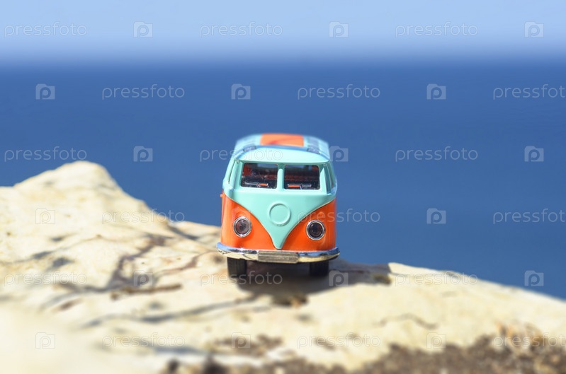 Винтажный миниатюрный оранжевый и синий фургон. Концепция путешествия
