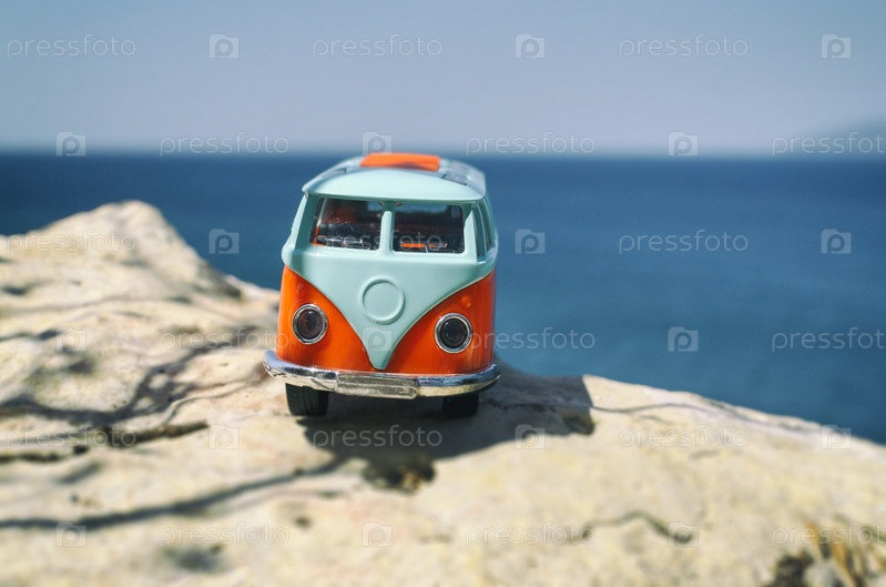 Винтажный миниатюрный оранжевый и синий фургон. Концепция путешествия