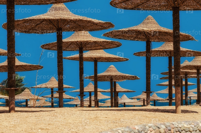 Шезлонг и зонтики на пляже на фоне голубого неба и моря. Египет, Хургада