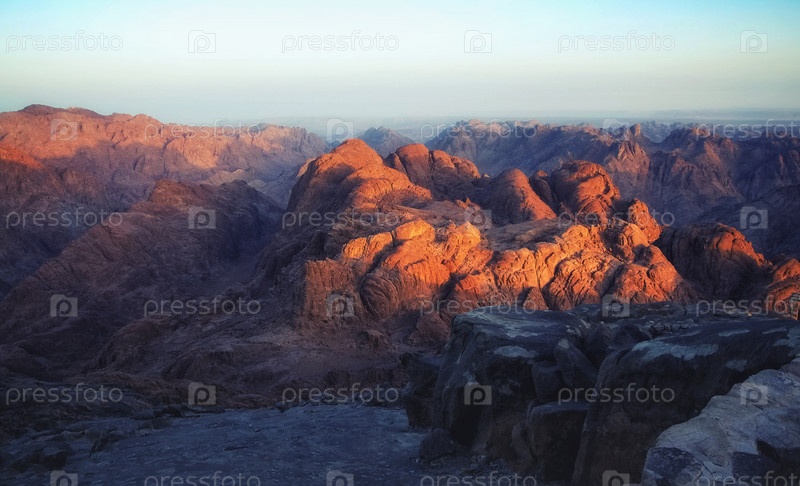 Восход солнца на вершине горы Моисей на Синайском полуострове в Египте
