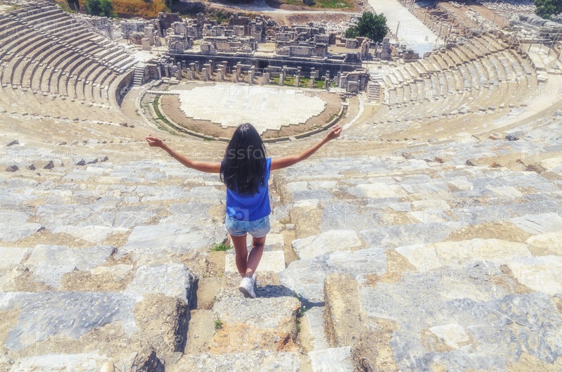 Молодая женщина-путешественница сзади. Известный Большой театр в Эфесе. Концепция путешествия
