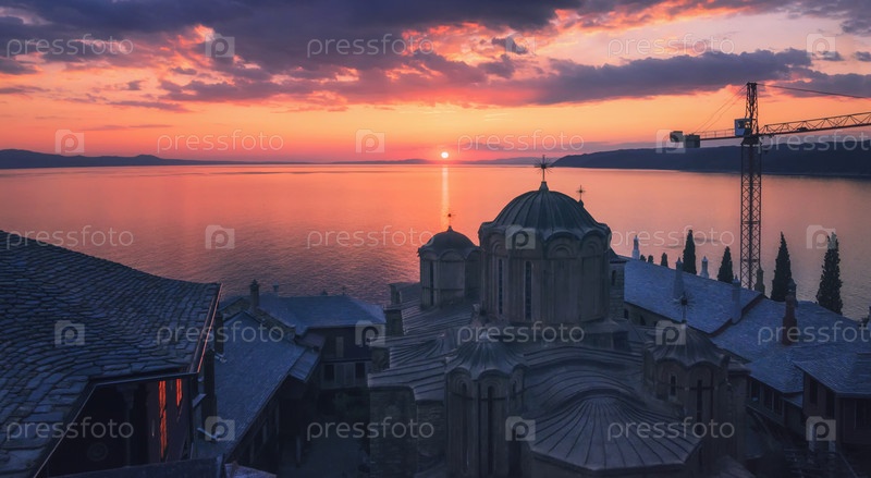 Закат в монастыре Дохиариу, полуостров Афон, гора Афон, Халкидики, Греция