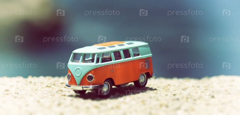 Винтажный миниатюрный оранжевый и синий фургон. Концепция путешествия