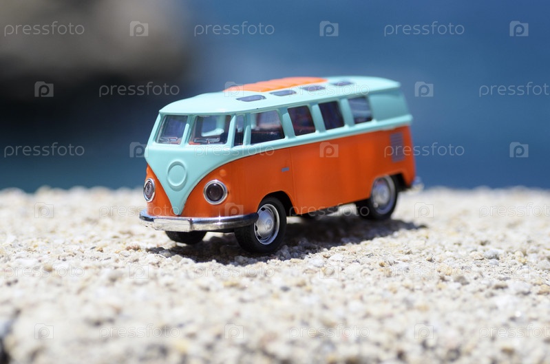 Винтажный миниатюрный оранжевый и синий фургон. Концепция путешествия