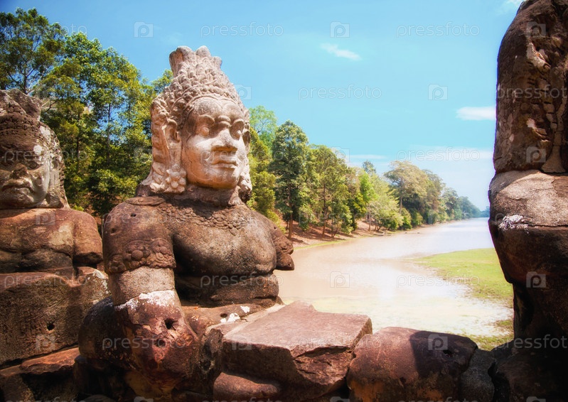 Статуи у входа в древний город Байон в храмовом комплексе Ангкор-Ват недалеко от Сиемреапа, Камбоджа