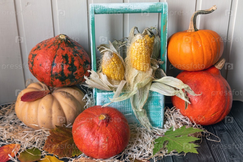Деревянный стол украшен овощами, тыквами, кукурузой и осенними листьями. Осенний фон. Концепция Дня благодарения или Хэллоуина