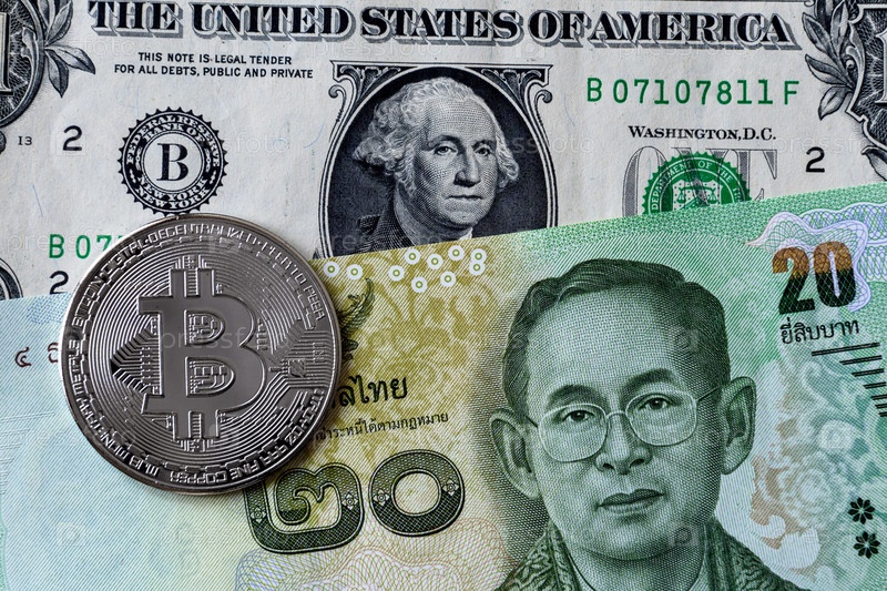 Крупный план монеты криптовалюты Биткойн с банкнотами таиландского бата