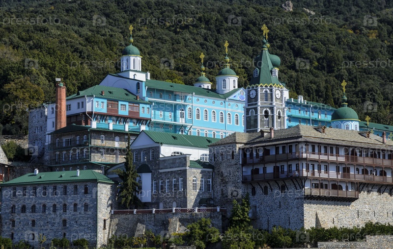 Панорамный вид на православный монастырь русского Святого Пантелеймона на горе Афон, Халкидики, Греция