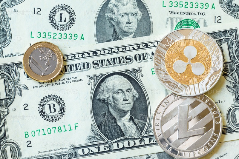 Серебряные монеты litecoin и пульсации и евро на бумажных долларовых банкнотах. современная цифровая криптовалюта виртуальная валюта. металлические монеты