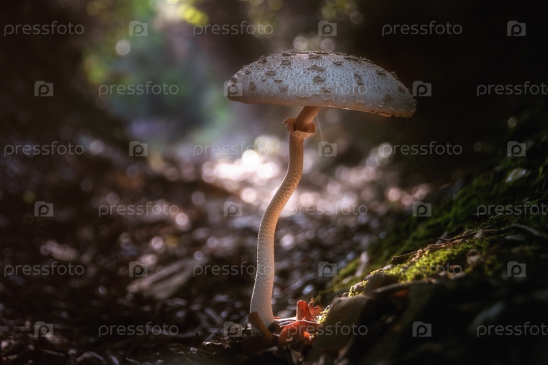 Гриб Lepiota procera (зонтик), растущий в лесных листьях Красавица с длинной тонкой ногой со скользящим кольцом и крупной чешуйчатой шляпой