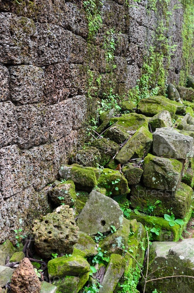 Каменная кладка стен и оград древних крепостных сооружений, покрытых зеленым мхом. Древний город Ангкор-Ват в Камбодже. Фоновая стена с текстурой зеленого мха и растений