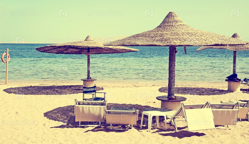 Шезлонг и зонтики на пляже на фоне голубого неба и моря. Египет, Шарм-Эль-Шейх