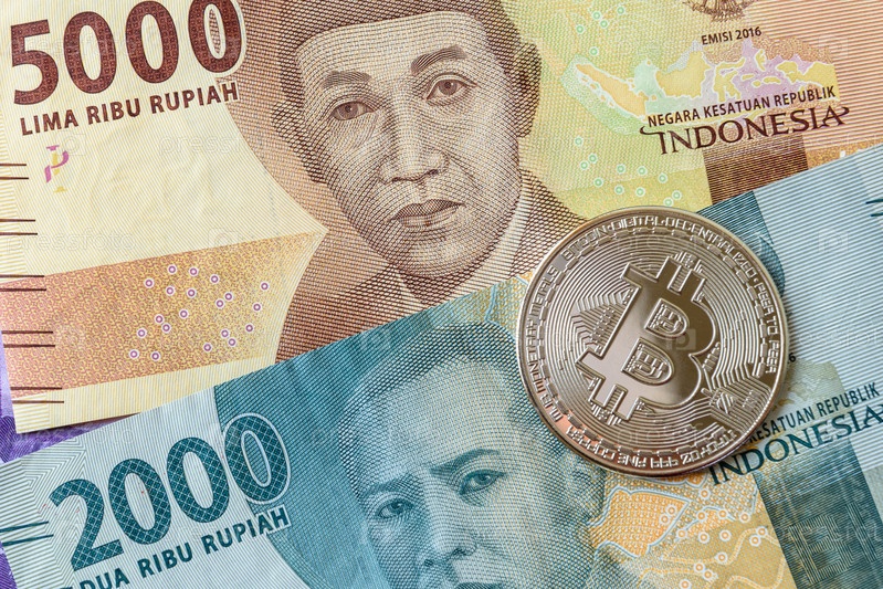 Биткойн с реальной банкнотой индонезийской рупии. Бизнес и финансовая концепция
