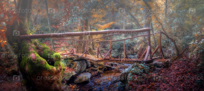 Старый деревянный мост через ручей в осеннем европейском лесу. Греция, Афон