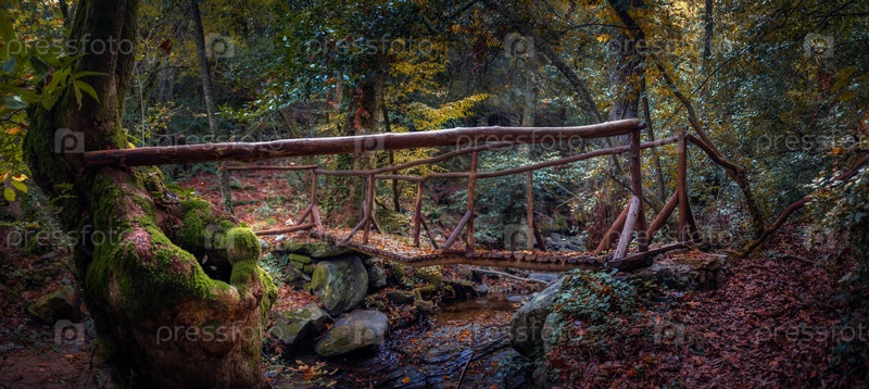 Старый деревянный мост через ручей в осеннем европейском лесу. Греция, Афон
