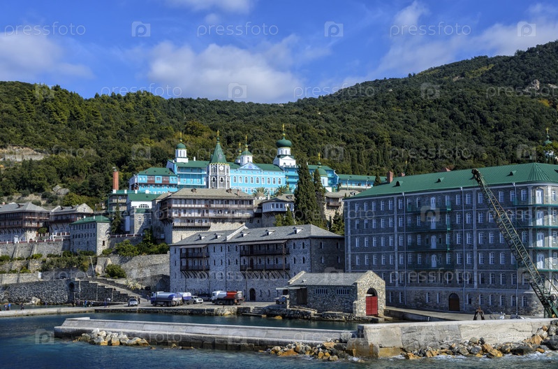 Панорамный вид на православный монастырь русского Святого Пантелеймона на горе Афон, Халкидики, Греция
