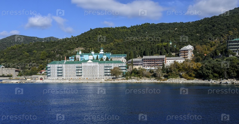 Панорамный вид на православный монастырь русского Святого Пантелеймона на горе Афон, Халкидики, Греция