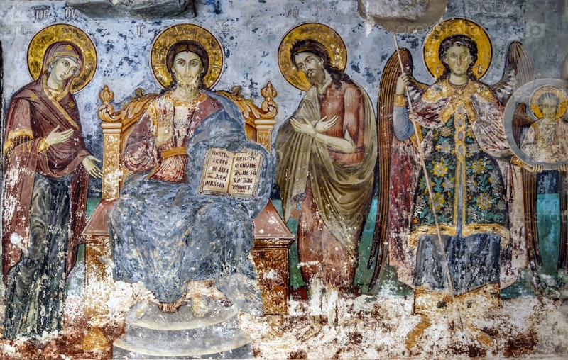 Гора Афон, Греция - 26 октября 2017 г.: Ветхие фрески святых на внешней стороне церкви Протатона в Карее, гора Афон