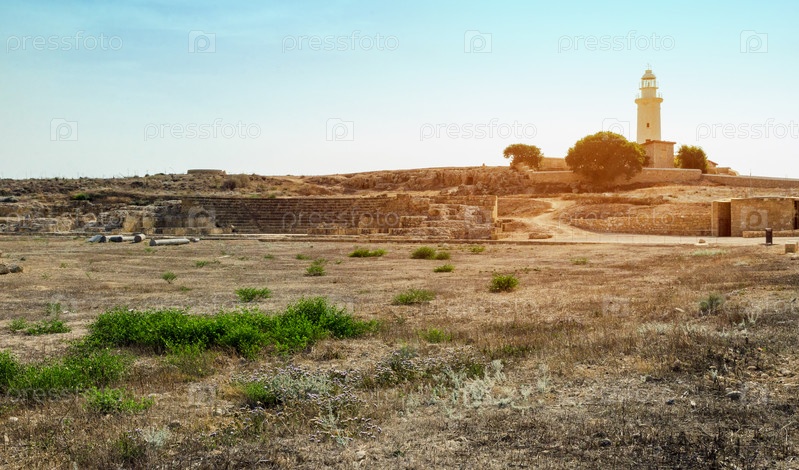 Древний амфитеатр Одеон в археологическом парке Пафоса (Като Пафос), гавань Пафоса, Кипр, панорамный вид. Живописный пейзаж с руинами средневековой архитектуры, маяка и голубого неба