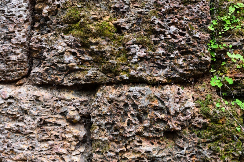 Каменная кладка стен и оград древних крепостных сооружений, покрытых зеленым мхом. Древний город Ангкор-Ват в Камбодже. Фоновая стена с текстурой зеленого мха и растений