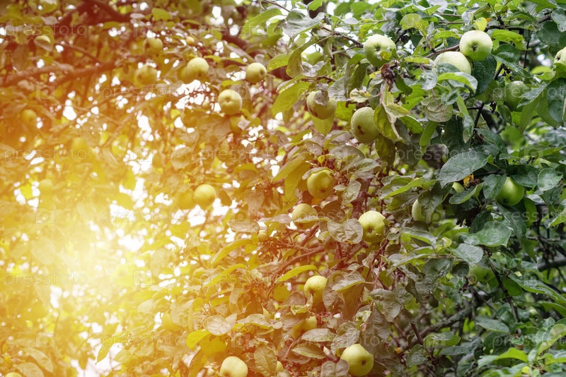 Органические яблоки, свисающие с ветки дерева в яблоневом саду