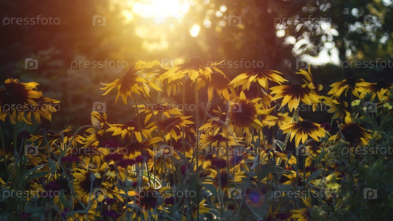 Фото для фона с группой желтых цветков рудбекии, сквозь которые проникает вечерний солнечный свет