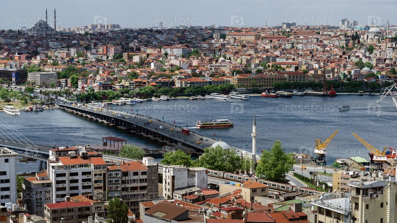Панорамный вид на Стамбул с Галатской башни. Мосты, мечети и Босфор. Стамбул, Турция