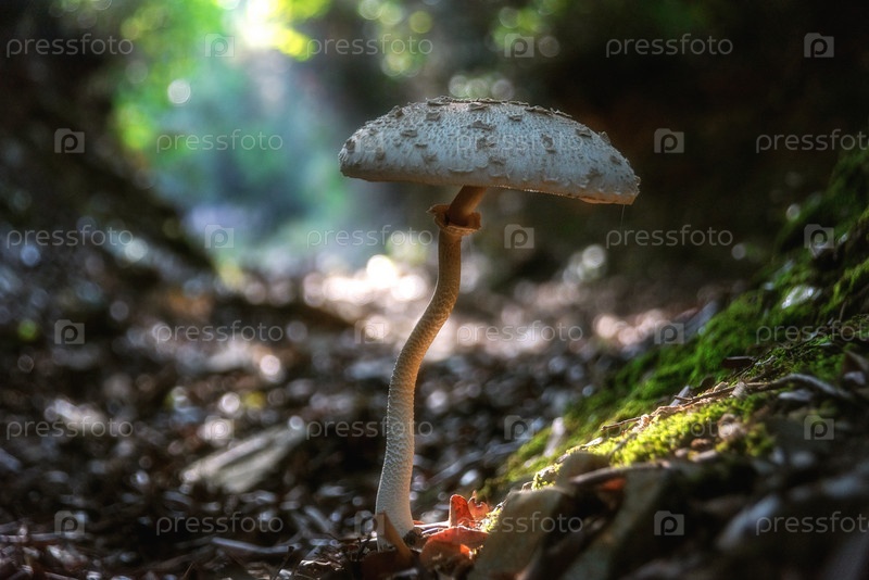 Гриб Lepiota procera (зонтик), растущий в лесных листьях Красавица с длинной тонкой ногой со скользящим кольцом и крупной чешуйчатой шляпой