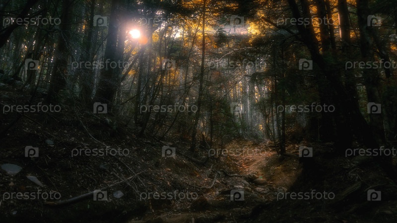 Красивый мистический лес и солнечные лучи, Греция, Афон