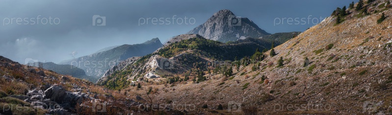 На вершине Агион Орос (гора Афон) в Греции. Горный пейзаж и спокойная природа