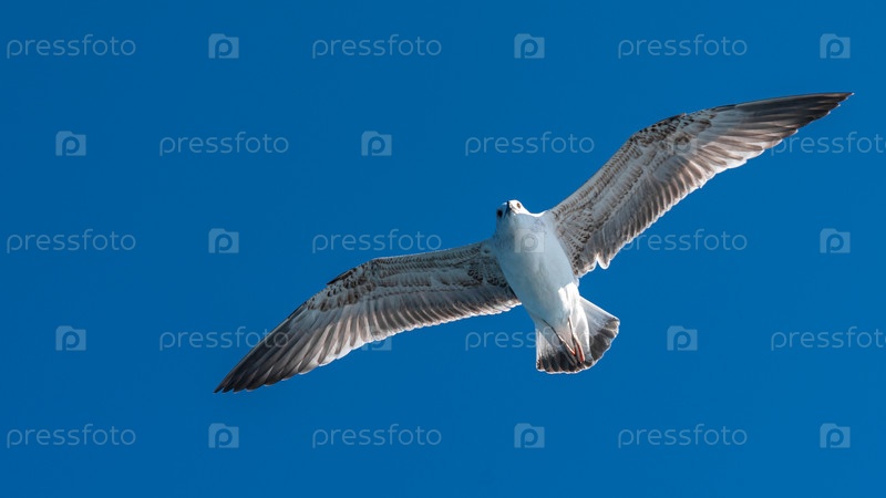 Белая чайка летит в голубом солнечном небе над побережьем моря