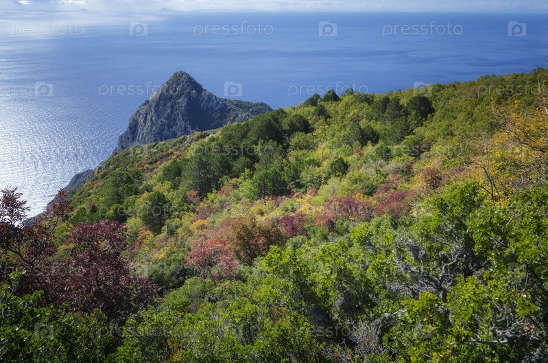 Красивый осенний пейзаж, вид с побережья полуострова Афон (Халкидики, Греция)