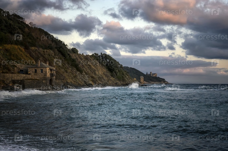 Вид на монастырь Ставроникита из порта Ивирон, гора Афон, Греция