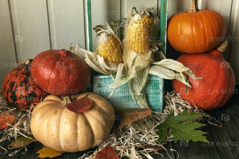 Деревянный стол украшен овощами, тыквами, кукурузой и осенними листьями. Осенний фон. Концепция Дня благодарения или Хэллоуина