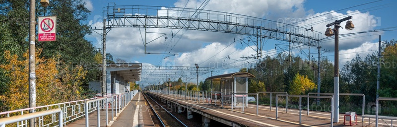 Город Воровского, Россия - 2 октября 2020 г. Пригородный поезд на платформе Храпуново в Подмосковье. Солнечный осенний вид