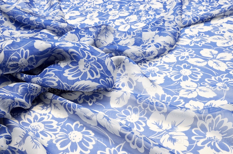 Шелковая ткань, шифон с большим цветочным орнаментом на синем