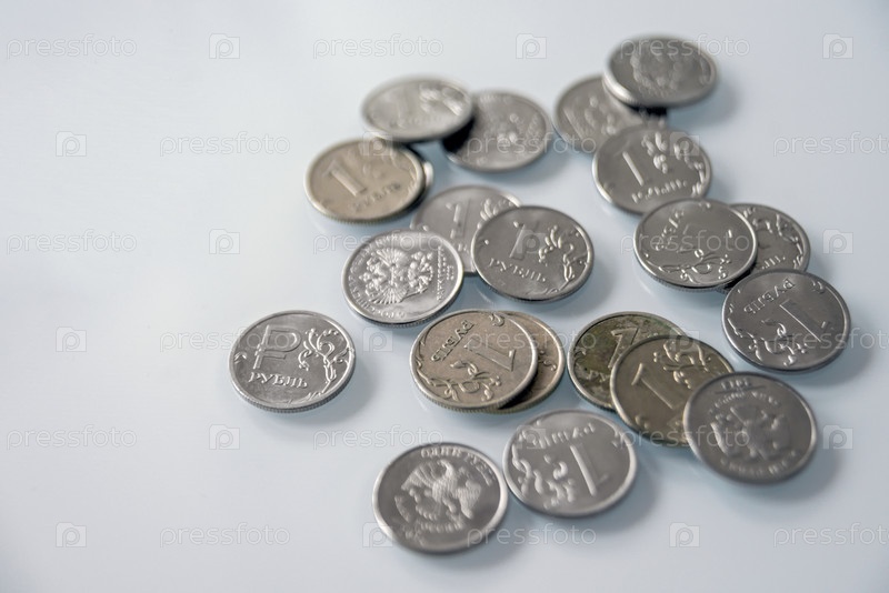 Монеты российского рубля на светлом фоне. Металлическая валюта. Деньги