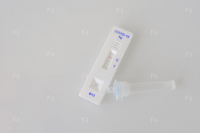 Экспресс-тест ПЦР на антиген covid-19 крупным планом, изолированный на сером фоне