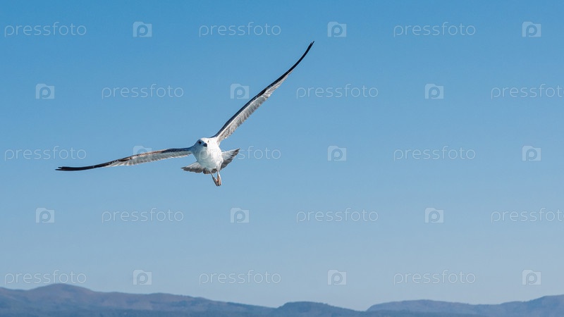 Белая чайка летит в голубом солнечном небе над побережьем моря