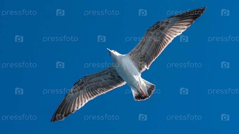 Белая чайка летит в голубом солнечном небе над побережьем моря