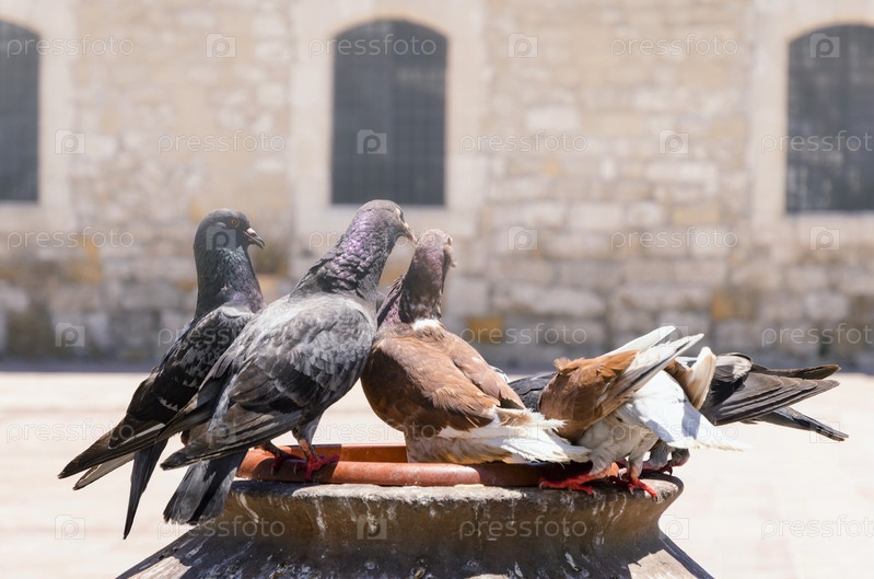 Голуби стоят возле каменной стены старой церкви, старый город Ларнака, Кипр