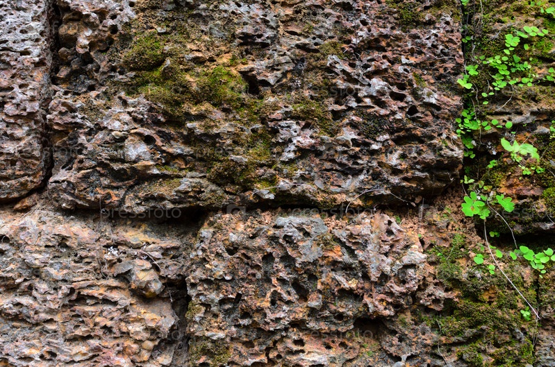 Каменная кладка стен и оград древних крепостных сооружений, покрытых зеленым мхом. Древний город Ангкор-Ват в Камбодже. Фоновая стена с текстурой зеленого мха и растений