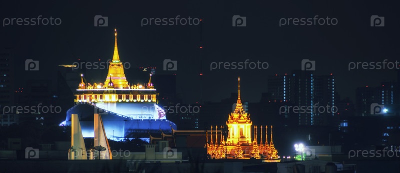 Ночной вид на храм Золотой горы, достопримечательность Бангкока, Таиланд