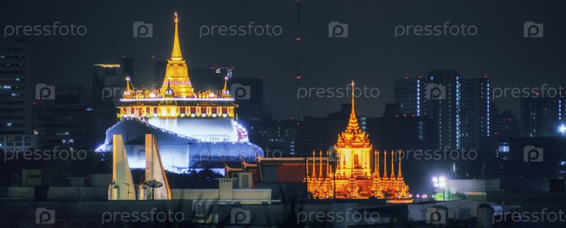 Ночной вид на храм Золотой горы, достопримечательность Бангкока, Таиланд