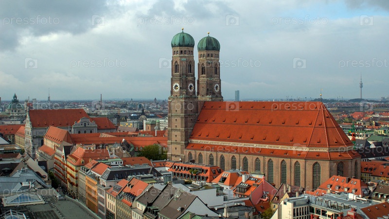 Вид с воздуха на собор Богоматери или Фрауэнкирхе из новой ратуши, Мюнхен, Бавария, Германия