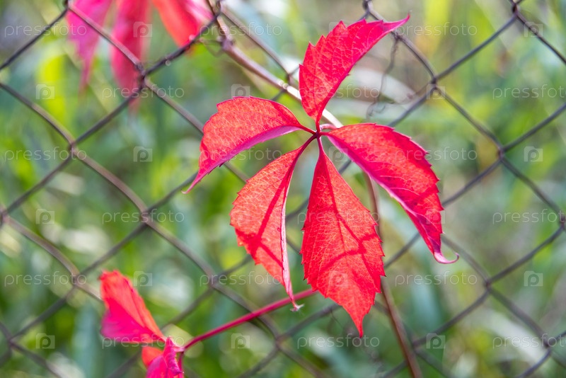 Красные листья дикого винограда на деревьях в парке, осенний сезон