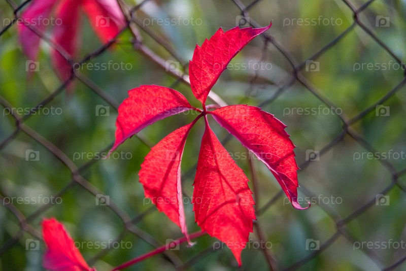 Красные листья дикого винограда на деревьях в парке, осенний сезон