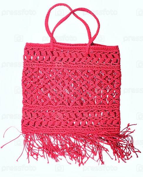 Вязаная красная сумка на белом фоне