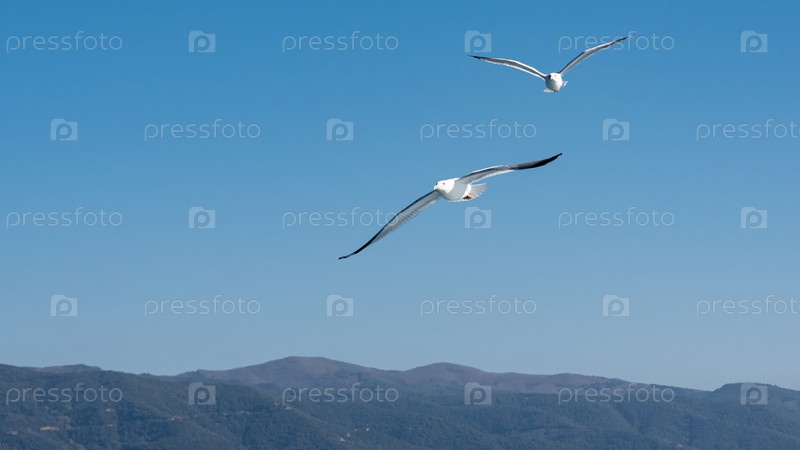 Белая чайка летит в голубом солнечном небе над побережьем моря