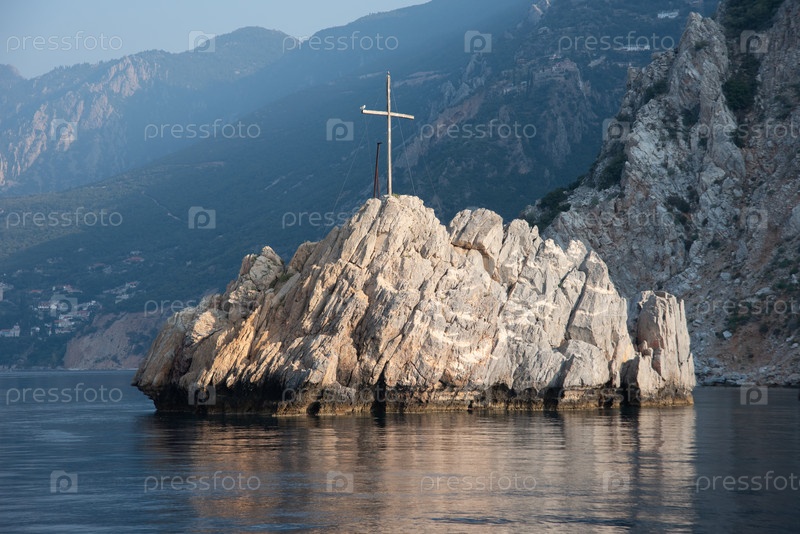 Горный вид на остров в море с деревянным крестом возле горы Афон, Греция